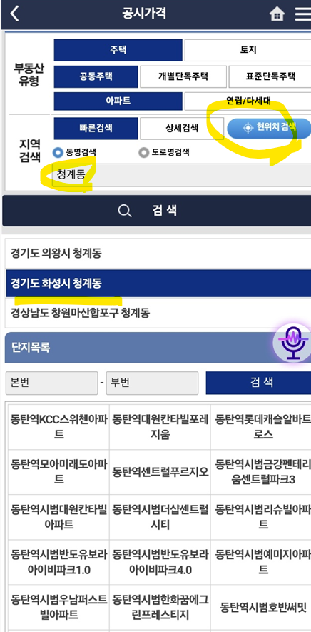 지금 살고 있는 아파트를 검색하시려면 "현위치 검색"을 해 보시면 편합니다.