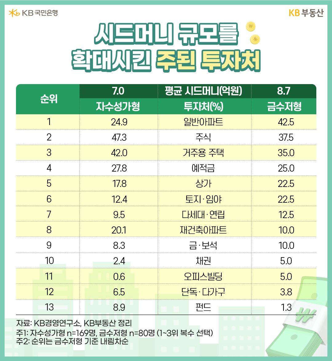금수저형은 일반아파트와 주식으로 시드머니를 늘린 반면, 자수성가형은 주식과 거주용 주택이 높습니다.
