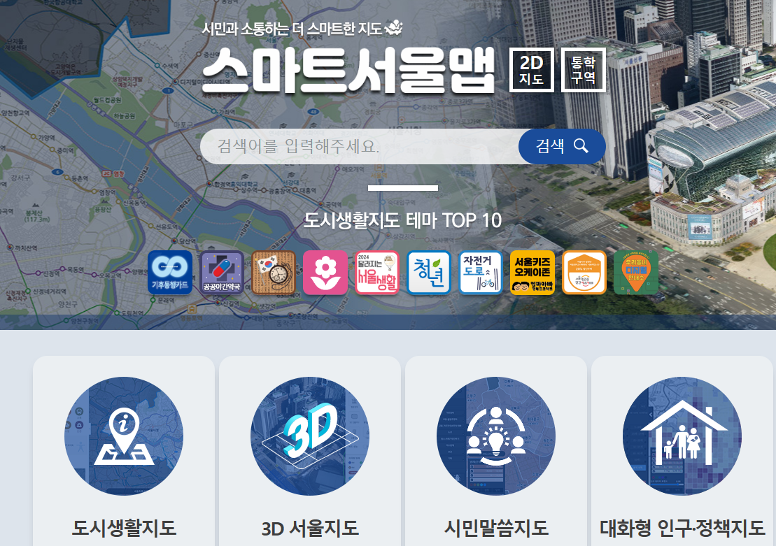 스마트서울맵은 도시생활지도, 3D 서울지도, 시민말씀지도, 코로나19 지도, 시민참여지도 등 대표 서울지도 서비스입니다.