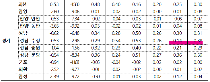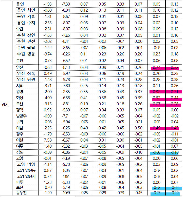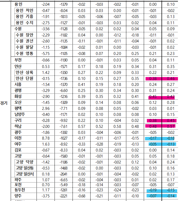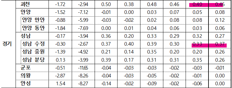 - 동두천시(-0.29%)는 생연지행동 위주로, 광주시(-0.11%)는 쌍령동초월읍 위주로, 김포시(-0.10%)는 운양마산동 위주로 하락했으나, 과천시(0.46%)는 별양중앙동 주요단지 위주로, 화성시(0.44%) 오산동남양읍 위주로, 하남시(0.42%)는 정주여건 양호한 망월풍산동 위주로, 성남 수정구(0.37%)는 수진창곡동 위주로 상승하며 경기 전체 상승폭 확대