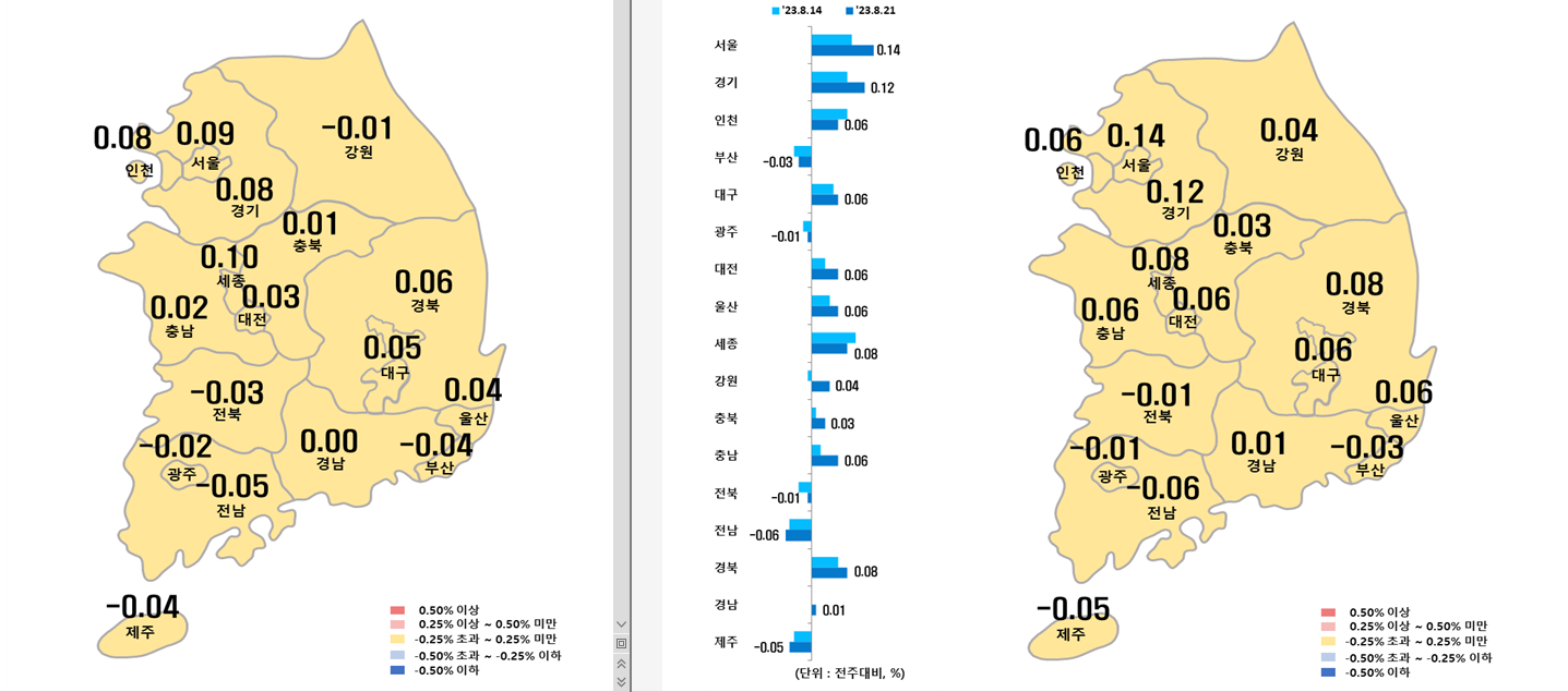 [지방 : 0.00%] 5대광역시 0.01% 하락, 세종 0.21% 상승, 8개도 0.00% 보합