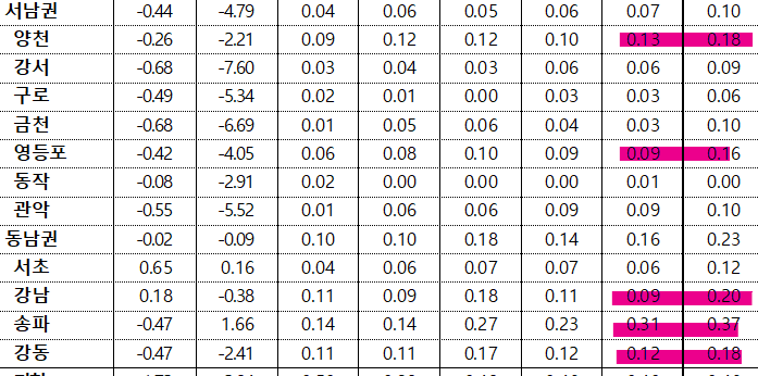 - (강남 11개구 : 0.15%) 송파구(0.31%)는 잠실·방이·문정동 주요단지 위주로, 강동구(0.25%)는 명일·암사고덕동 신축 위주로, 구로구(0.15%)는 신도림·개봉구로동 선호단지 위주로, 강남구(0.15%)는 역삼·대치·개포동 주요단지 위주로 상승 지속