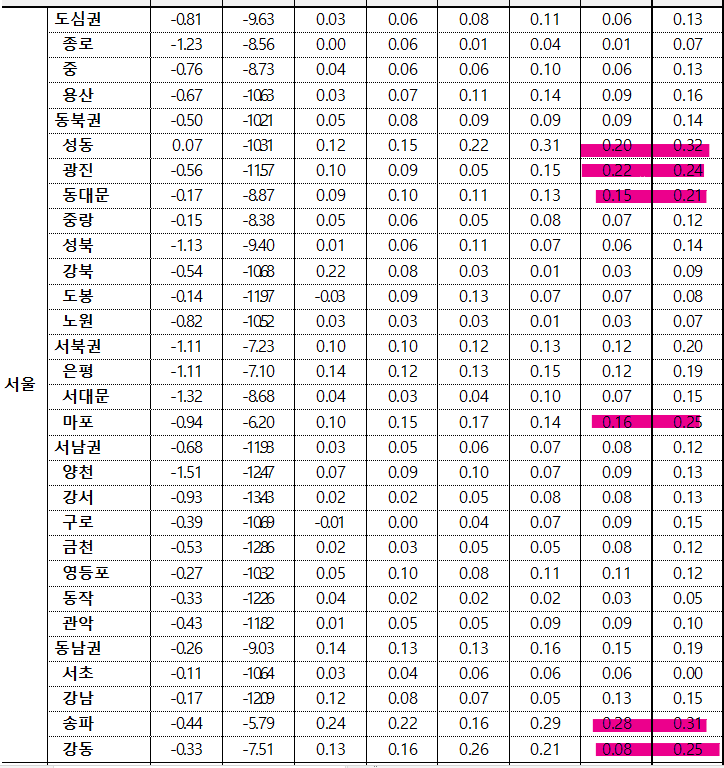 - (강북 14개구 : 0.16%) 성동구(0.32%)는 성수·금호행당동 중소형 평형 위주로, 마포구(0.25%)는 아현성산·공덕동 주요단지 위주로, 광진구(0.24%)는 광장구의·자양동 역세권 및 학군지 위주로, 동대문구(0.21%)는 이문휘경장안동 위주로, 은평구(0.19%)는 불광·응암·신사동 위주로 상승 지속