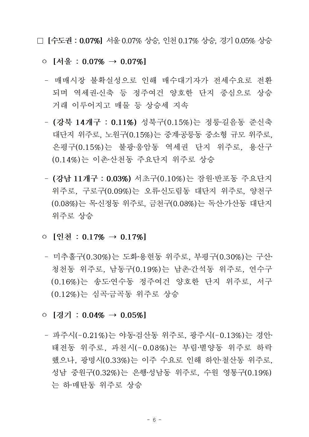 - (강남 11개구 : 0.03%) 서초구(0.10%)는 잠원‧반포동 주요단지 위주로, 구로구(0.09%)는 오류‧신도림동 대단지 위주로, 양천구(0.08%)는 목‧신정동 위주로, 금천구(0.08%)는 독산‧가산동 대단지 위주로 상승