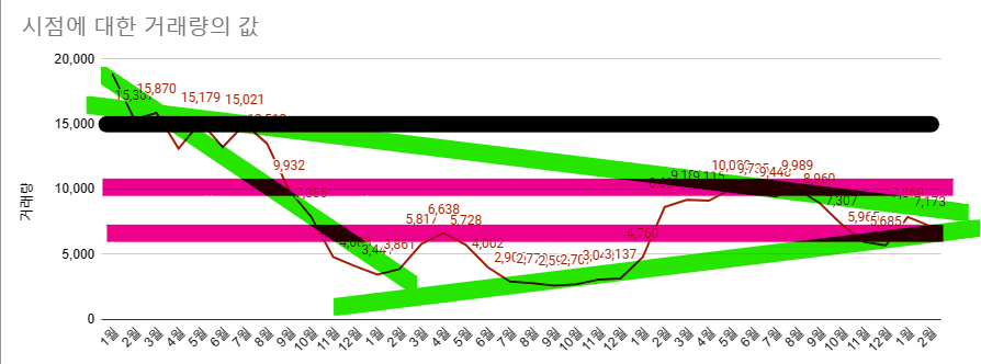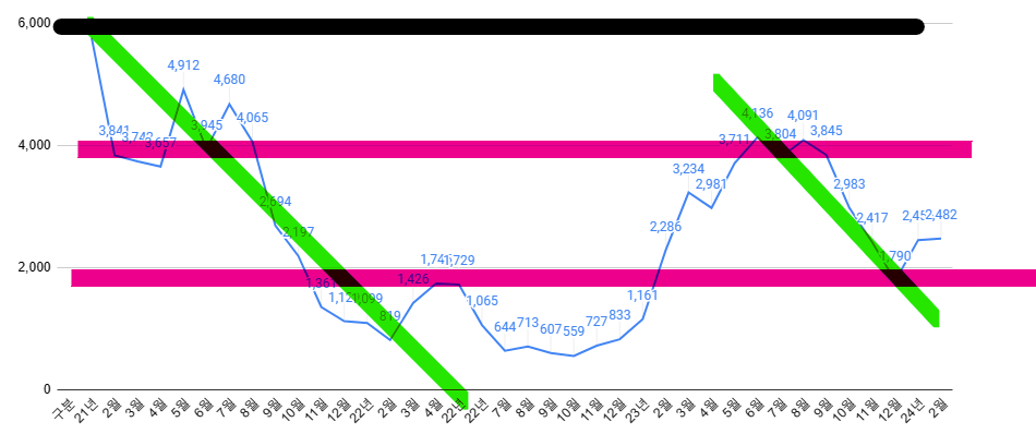 - 비슷한 수준인 21년 2월이면 기억하기로, 한참 상승이 일어났을땐데, 저기 위 매매거래도 2월에 확 줄어든 차트가 보입니다.
