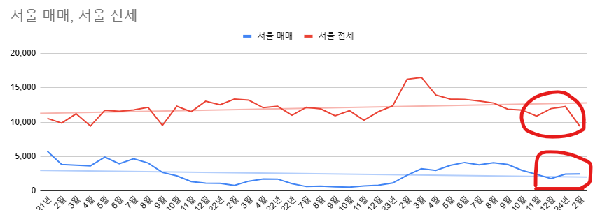- 역대급으로 거래량이 많이 줄었습니다. 수도권 사람들은 많은 사람들이 서울 집 매수를 원하고 있고, 그래서 2월의 부동산은 "눈치보기"인듯 합니다.