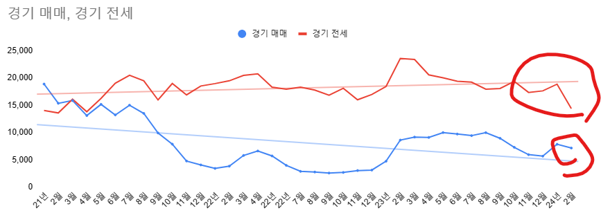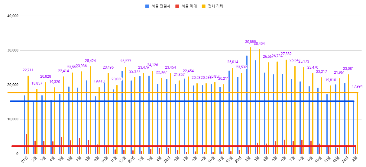 - 전월세 거래량이 역대급으로 줄어들었습니다. 21년 2월 수준이네요.