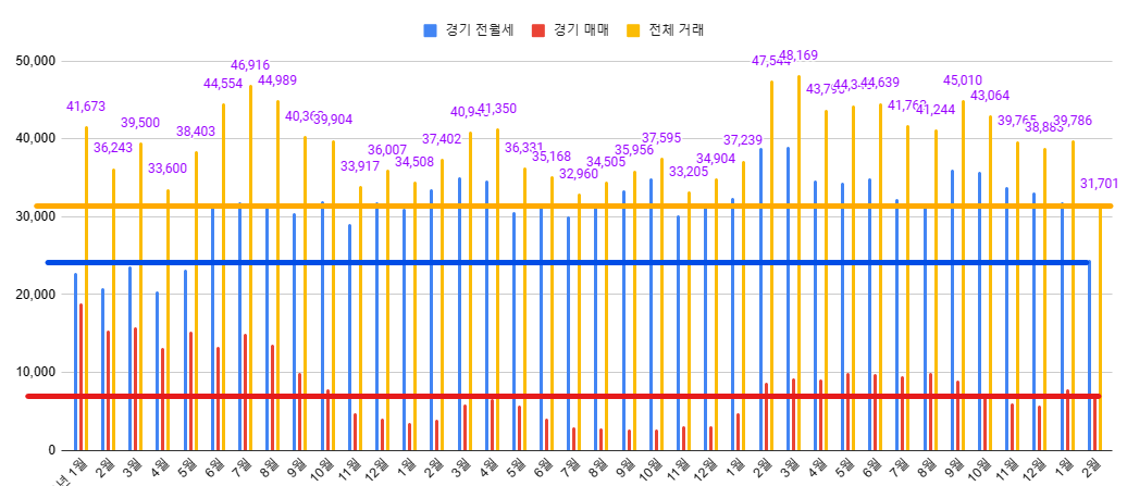 [검정색 : 기준선 - 경기도 평균 매매거래건수 - 경기는 15천건입니다]