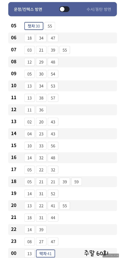 막차는 주중엔 23시 56분, 주말엔 00시 41분이네요