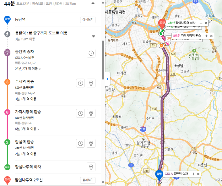 어제 잠실나루에서 9시 30분 출발했는데, 9호선-8호선-3호선-GTX 타고 집까지 오는데 딱 1시간 5분 걸렸습니다.