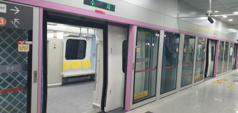 안전문은 서울의 전철과는 약간 다르게 SRT와 같은 형태를 가지고 있습니다