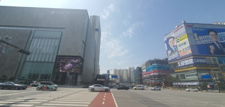 동탄 역 앞 롯데 백화점 사거리에 도착합니다.