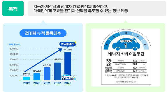 - 자동차 제작사의 전기차 효율 향상을 촉진하고, 대국문에게 고효율 전기차 선택을 유도할 수 있는 정보 제공