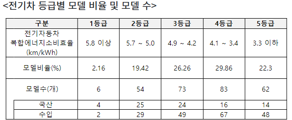 - 국내 신고된 시판 중인 모든 전기차에 대해 에너지소비효율을 1~5등급으로 표시