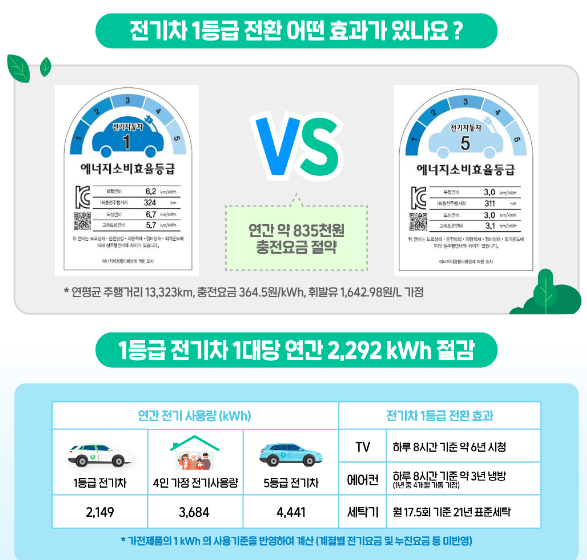 - 1등급 전기차로 전환 시 연간 약 83만 5천 원 충전요금 절약(5등급 전기차 대비)