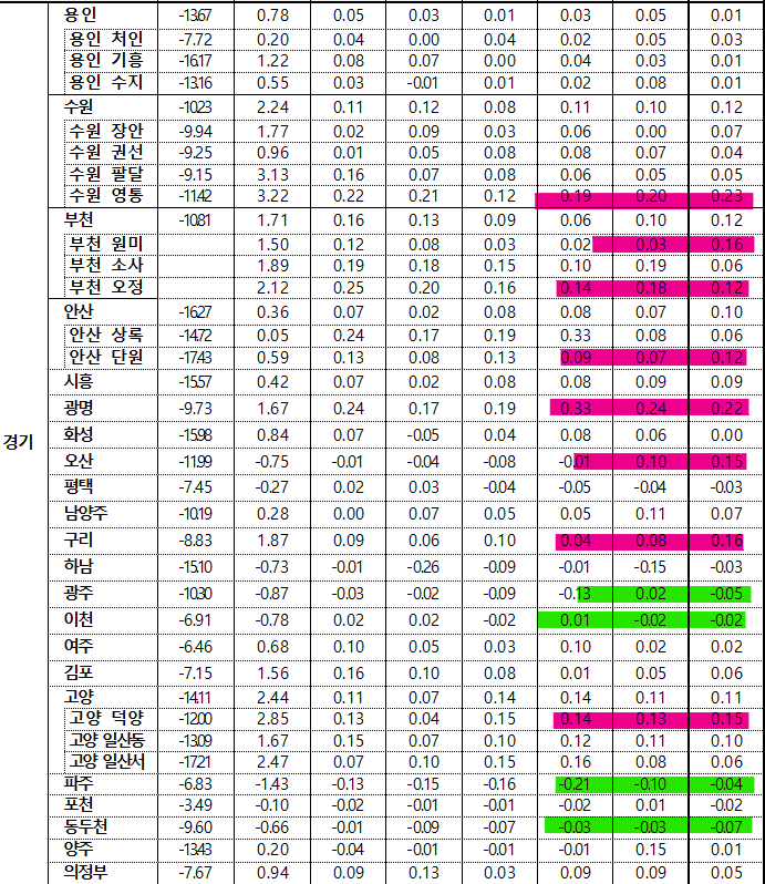 - 안양 동안구(-0.11%)는 입주물량 영향있는 호계‧비산동 위주로, 고양 일산동구(-0.08%)는 식사‧풍동 위주로, 이천시(-0.08%)는 송정동‧부발읍 구축 위주로 하락했으나, 오산시(0.12%)는 세교‧오산동 위주로, 고양 덕양구(0.12%)는 덕은‧행신동 준신축 위주로, 화성시(0.09%)는 병점‧진안동 위주로 상승하며 경기 전체 하락에서 보합 전환