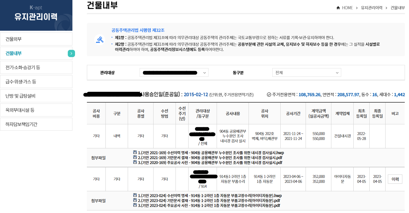 꽤 자세하네요. 건물의 내외부 뿐 아니라, 어느 동에 했는는지와 검사 결과, 계약 금액까지 모두 공개되고 있습니다.