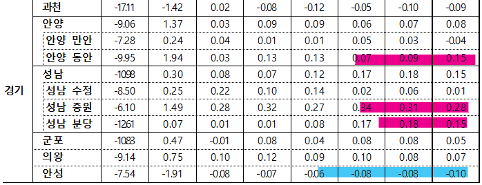 - 광주시(-0.12%)는 송정동 및 초월읍 위주로, 안성시(-0.10%)는 당왕동 및 공도읍 주요단지 위주로 하락했으나, 성남 중원구(0.28%)는 은행‧금광동 중소형 규모 위주로, 수원 영통구(0.28%)는 원천‧매탄동 주요단지 위주로, 광명시(0.24%)는 하안‧광명동 위주로, 안산 단원구(0.18%)는 정주여건 양호한 초지‧선부동 위주로 상승