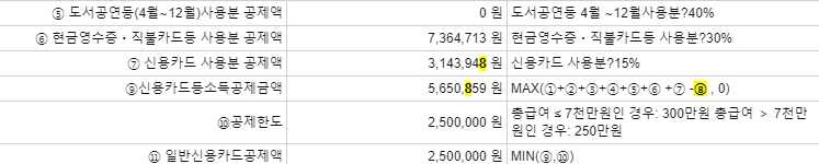 어? 그런데.. 한가지 이상합니다. ⑨번 항목의 신용카드등 소득공제 금액은 5,650,859원인데,