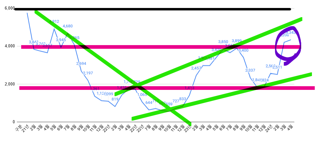 역시 평균 거래량이 되려면 아직 갭이 좀 있습니다. 사실 추이로 보면 4월에는 그래도 5천건 까지는 가지 않을까 싶었는데, 그러지는 못했습니다.