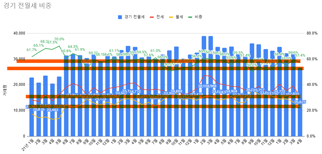 - 4월 전월세는 크게 줄었습니다. 수치나 비율상으로 보자면 21년 2월수준이네요. 이때는 심리가 완전히 바닥을 쳤을땐데 말이죠.