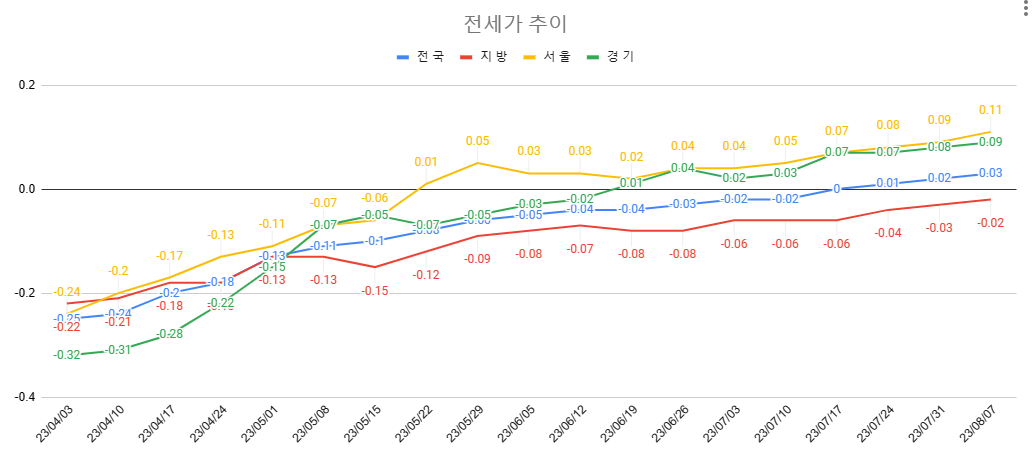 - 전체적으로 우상향의 모양이죠? 이번주 유의할만한 내용은 드디어 지방도 매매가가 하락을 멈췄다는 사실입니다. (물론 지역별로 다르겠습니다만)