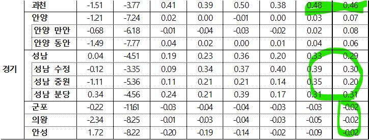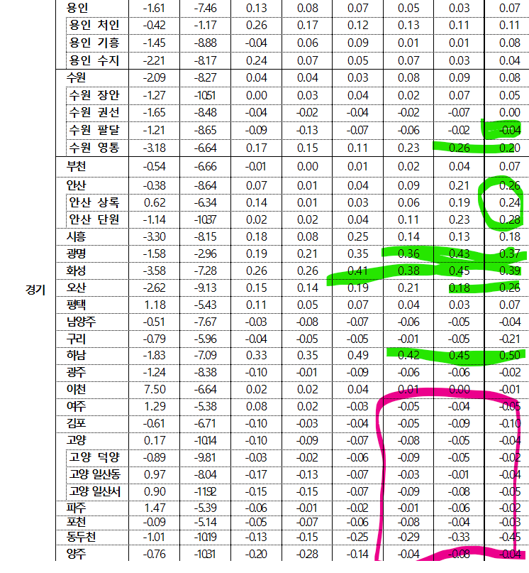 ☞ 이게 사실 같은 지역이 몇주째 지속적으로 나오고 있습니다. 호재가 많은 남쪽은 많이 오르고, 공급이 많은 북쪽은 떨어지는 현상이죠. 재미있는건. 제가 있는 화성시를 보면, 그 넓은 화성시 중에서도, 동탄2 지역이 지속적으로 나오고 있는데, 동탄2 중에서도 대장단지인 청계동의 우포한이 지난주까지 나왔다면, 이제는 다음 급지인 목동, 장지동의 상승이 나오고 있다는 겁니다. 뭔지 모르게 흐름이 퍼지는 듯한 모양입니다.
