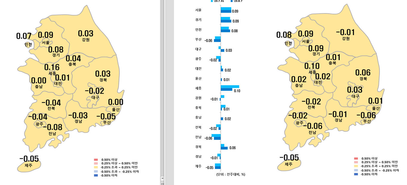 □ [지방 : 0.00%] 5대광역시 0.01% 하락, 8개도 0.00% 보합, 세종 0.10% 상승