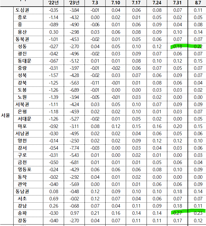 - (강북 14개구 : 0.10%) 성동구(0.31%)는 행당·옥수‧금호동 주요단지 위주로, 은평구(0.15%)는 녹번‧불광·신사동 위주로, 마포구(0.14%)는 염리‧용강·대흥동 주요단지 위주로, 용산구(0.14%)는 이태원‧이촌동 위주로, 동대문구(0.13%)는 이문·용두동 위주로 상승하는 등 강북 전체 상승폭 확대