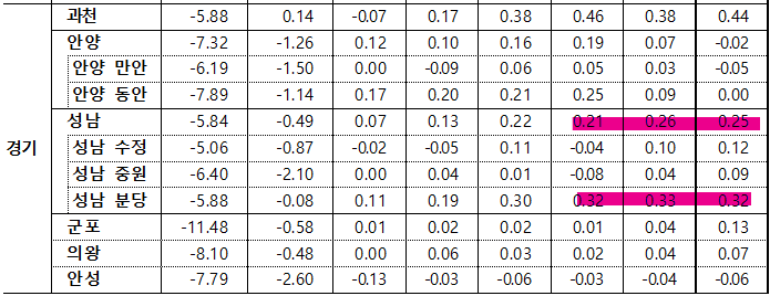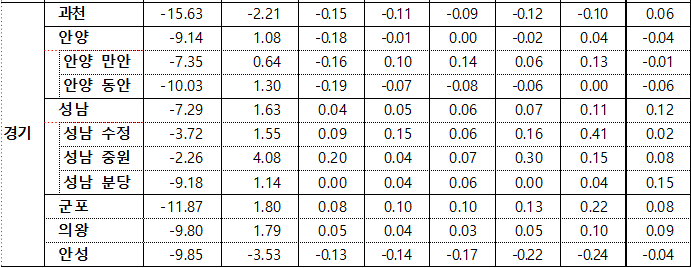 - 이천시(-0.02%)는 부발읍 및 안흥동 위주로, 안성시(-0.01%)는 공도읍 소형 규모 및 당왕동 위주로 하락했으나, 과천시(0.45%)는 교통여건 양호한 부림·중앙동 신축 위주로, 성남 수정구(0.23%)는 정주여건 양호한 창곡동 위주로, 수원 영통구(0.22%)는 망포·원천동 주요 대단지 위주로, 성남 분당구(0.21%)는 정자·서현동 역세권 위주로 상승