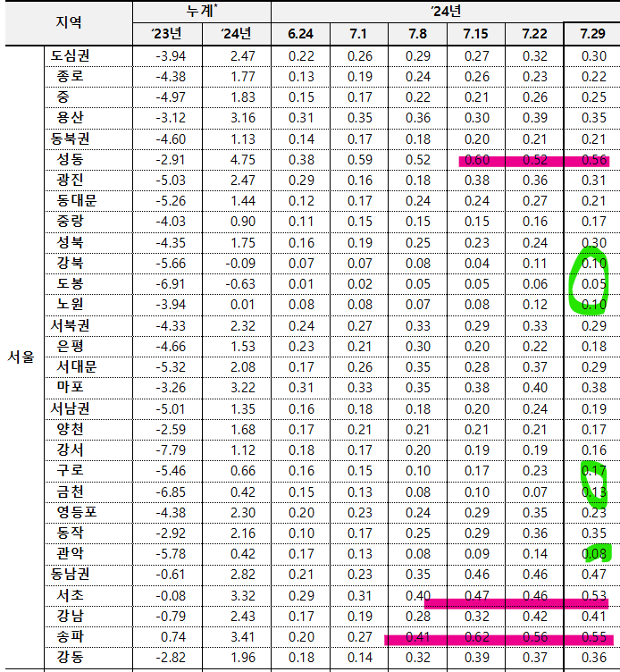 - (강북 14개구 : 0.18%) 성동구(0.38%)는 금호‧응봉동 주요단지 위주로, 노원구(0.24%)는 상계·중계동 역세권 단지 위주로, 용산구(0.23%)는 도원·이촌동 위주로, 마포구(0.22%)는 도화‧염리동 중소형 규모 위주로, 종로구(0.19%)는 창신‧무악동 위주로 상승