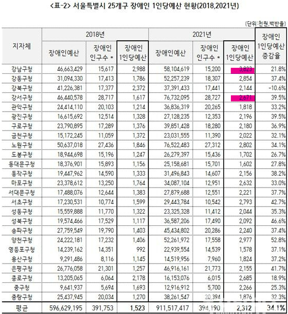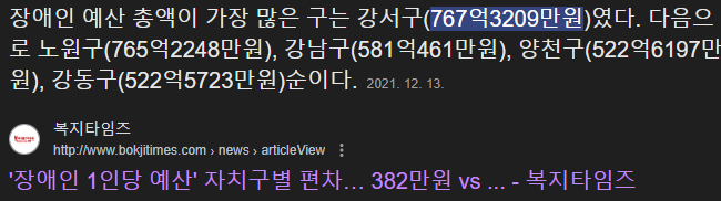 아니, 강서구도 낮은 편은 아닌데, 총액을 전체 장애인 수로 나누니, 강남구에는 많이 못미칩니다.