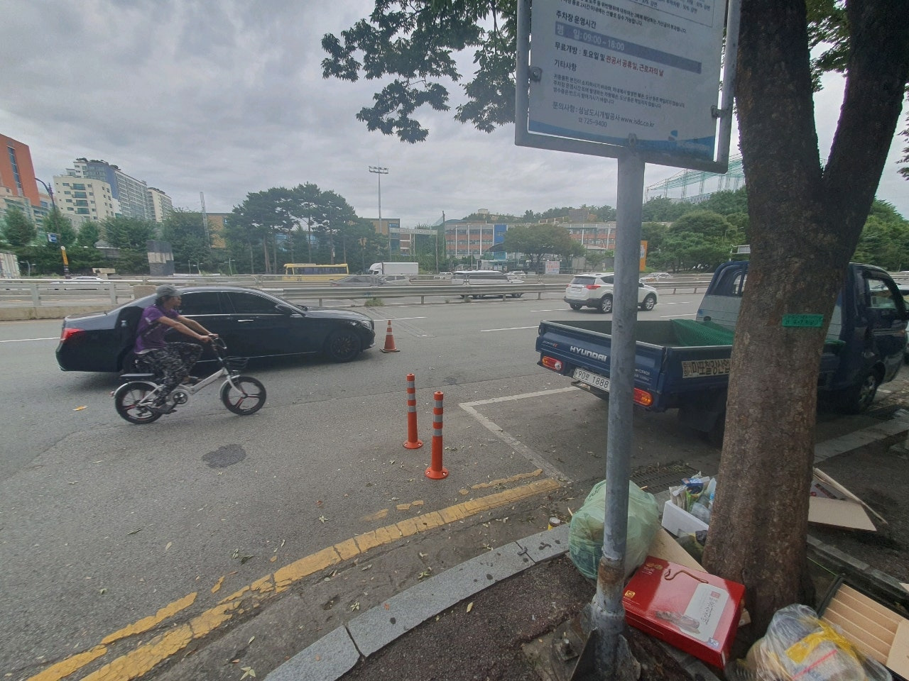 주차장을 알려주는 표지판 밑에 쓰레기가 쌓여있구만요.