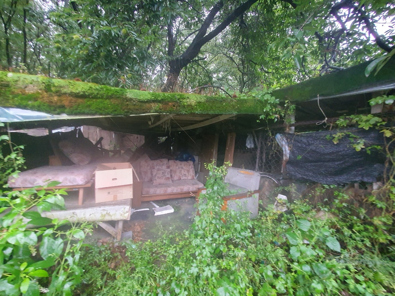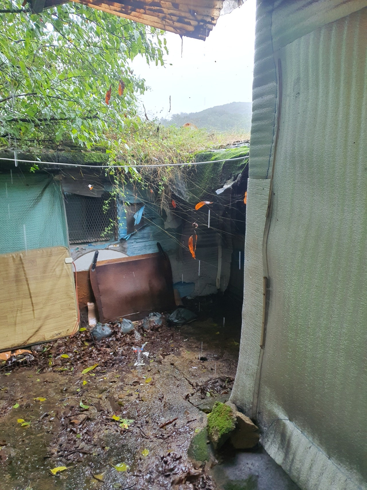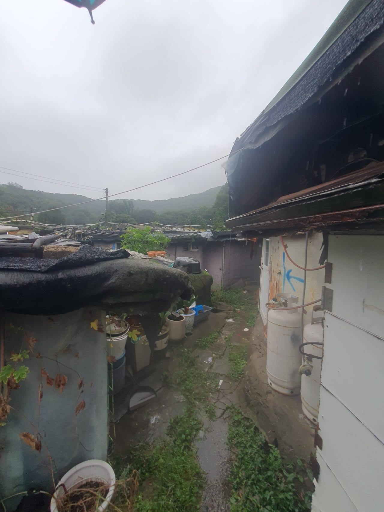 저 너머에 보이는 건 지붕을 눌러둔 돌들, 미처 정리하지 못한 가재 도구들입니다.