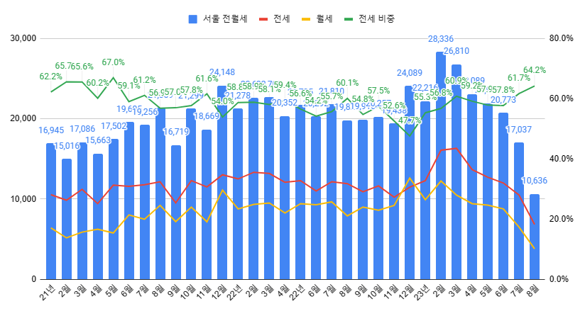 먼저 서울시의 전월세 동향입니다. 역시나 8월은 거래가 끝나지 않았으니, 7월까지 우선 보죠