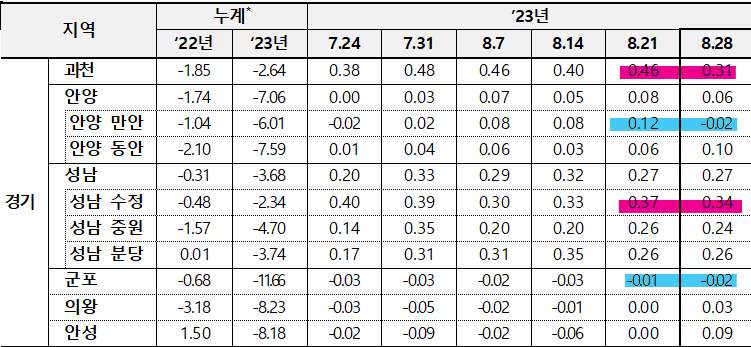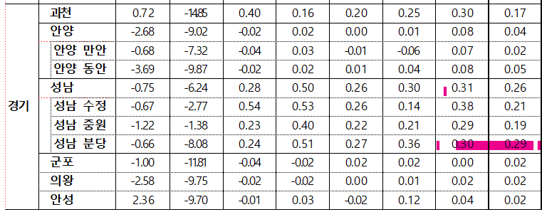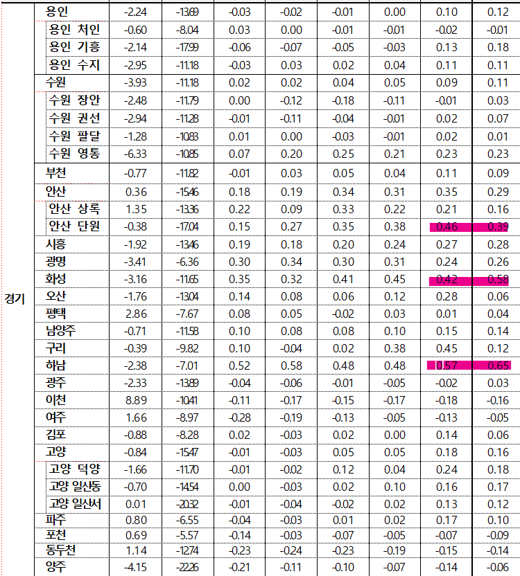 - 이천시(-0.16%)는 대월면·송정동 구축 위주로 하락했으나, 하남시(0.65%)는 감이·풍산동 신도시 신축 위주로, 화성시(0.58%)는 정주여건 양호한 청계·반송동 주요단지 위주로, 안산 단원구(0.39%)는 선부·고잔동 대단지 위주로, 성남 분당구(0.29%)는 야탑·이매동 중저가 위주로, 시흥시(0.28%)는 조남·능곡·월곶동 위주로 상승