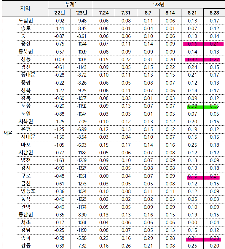 ☞ 역시 용산구(용산재개발구역), 동대문구(청량리), 마포구(북아현)이라는 재개발, 재건축 위주로 상승입니다. 물론 다른 지역도 다 오르고 있겠지만, 특히 이 지역이 더 오른다는 거겠죠.