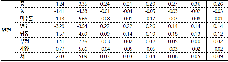 - 동구(-0.03%)는 송현‧송림동 위주로, 계양구(-0.02%)는 작전‧용종동 구축 위주로 하락했으나, 중구(0.26%)는 중산‧운서동 대단지 위주로, 연수구(0.14%)는 정주여건 양호한 송도‧연수동 위주로, 남동구(0.12%)는 논현‧구월동 위주로 상승