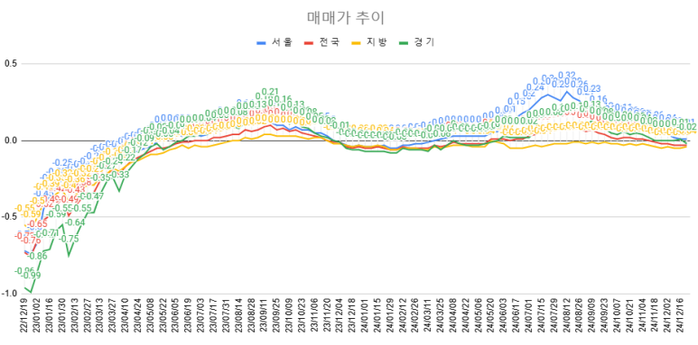 - 매매가는 2년간 (정확히는 2월부터 12월까지)의 작은(?) 상승 사이클을 마무리 하고 있는 수순으로 보인다.