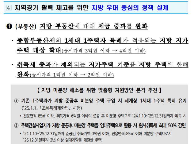 다주택자 양도세 중과배제 1년 연장…지방 부동산 세금 대폭 완화 [2025 경제정책방향], 부동산 종부세 1세대1주택자 특례 적용되는 지방 저가주택대상, 공시가격 3억원에서 4억원으로 높아져 취