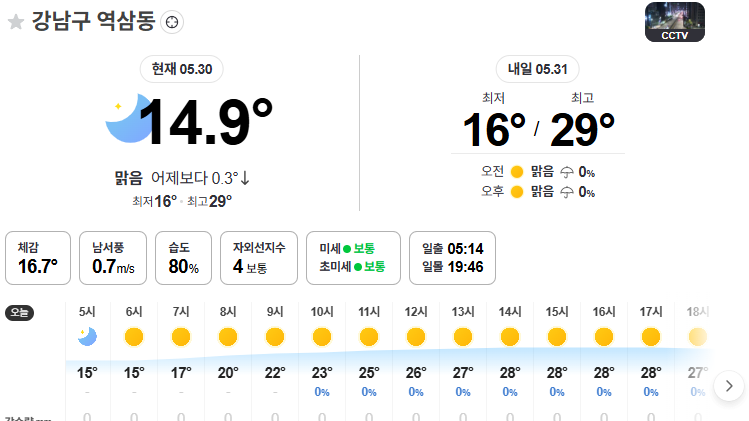 와. 오늘 낮기온은 29도까지 올라가는 군요.