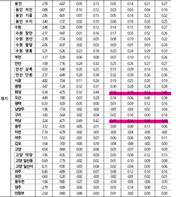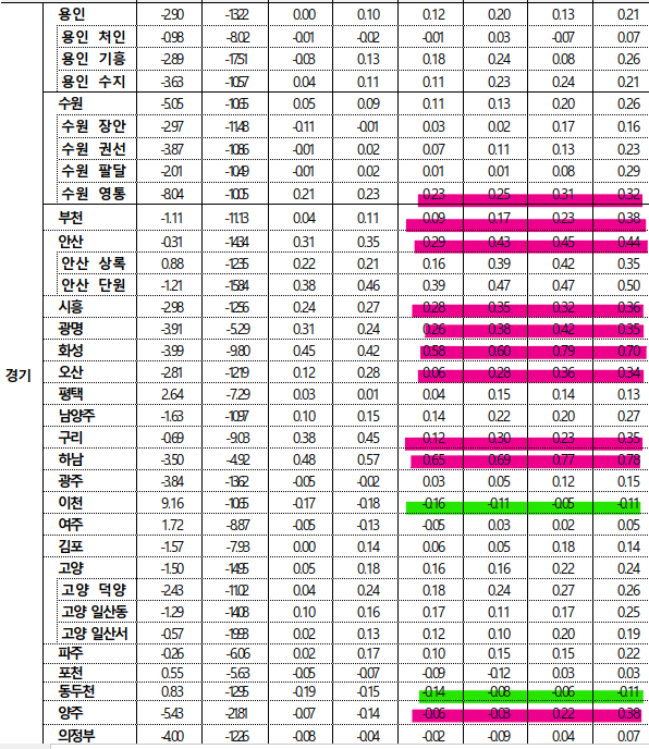 ☞제가 0.3 이상인 상승만 빨강색으로 칠해 봤는데요. 이번주에 확 오른 지역이 꽤 많네요. 하남, 화성등은. 0.7%가 오르는 등, 엄청난 상승과, 양주, 포천, 의정부등의 북쪽도 상승세가 시작된 모양새에요.