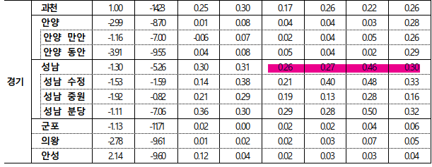 - 잘 안보이시겠지만, 서울이 지난주 0.13에서 0.12로 약간 상승폭이 낮아졌습니다. 최근 4주간 0.13, 0.11, 0.13. 0.11을 기록중이네요.