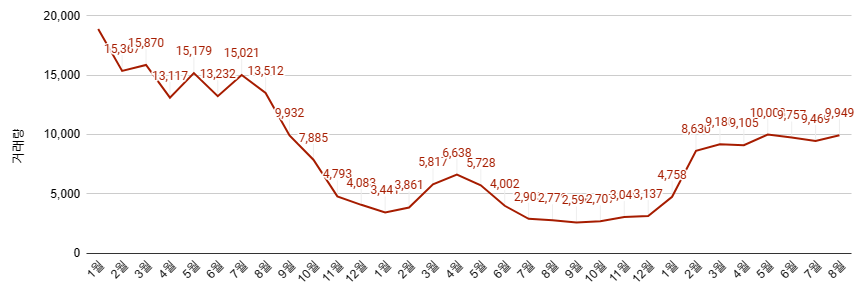 - 8월 거래량은 6월 거래량 수준을 회복한 수준입니다. 추석을 앞두고 보수적인 거래가 일어나지 않았나 생각해 봅니다.