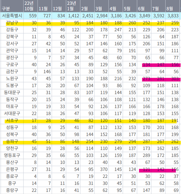 다만, 최근에 많이 늘어나고 있는 지역은 은평구, 구로구, 노원구등 중저가 아파트가 많이 포진한 곳으로 보입니다.