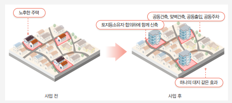 | 이점 | 정비구역 지정 및 추진위원회 구성 절차 생략으로 사업 기간 단축이 가능함(평균 3-4년) | 용적율 및 건축 규제 완화 |