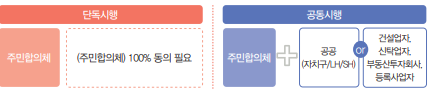 주민합의체 단독 또는 공공과 공동으로 시행할 수 있습니다. 단독으로 시행하는 경우 주민들의 동의를 얻어 주민합의체를 구성하여 사업을 할 수 있으며, 단독으로 하기 어려운 경우 공공과 함께 공동시행도 가능합니다.