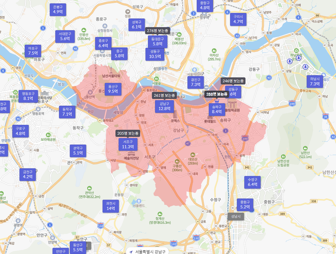 보시는 것 처럼, 용산 + 강남 3구가 모두 표기 된걸볼 수 있습니다.