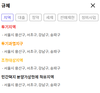 추가로, 부동산 지인에서는 지역마다 찍으면 조정대상지역인지 투과지역인지 등이 표기된다고 하는데