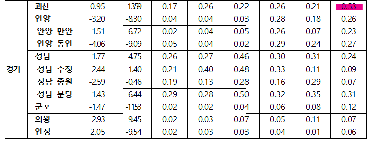 - 이천시(-0.05%)는 부발읍·송정동 위주로, 의정부시(-0.03%)는 호원·신곡동 위주로 하락했으나, 과천시(0.45%)는 부림·중앙동 신축 위주로, 하남시(0.39%)는 신장·덕풍동 위주로, 안양 동안구(0.34%)는 호계·비산동 구축 위주로, 성남 분당구(0.32%)는 정주여건 양호한 수내·정자동 위주로, 화성시(0.30%)는 병점·반월동 대단지 위주로 상승